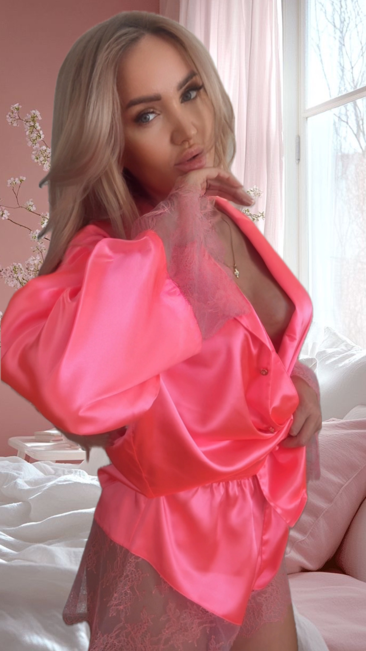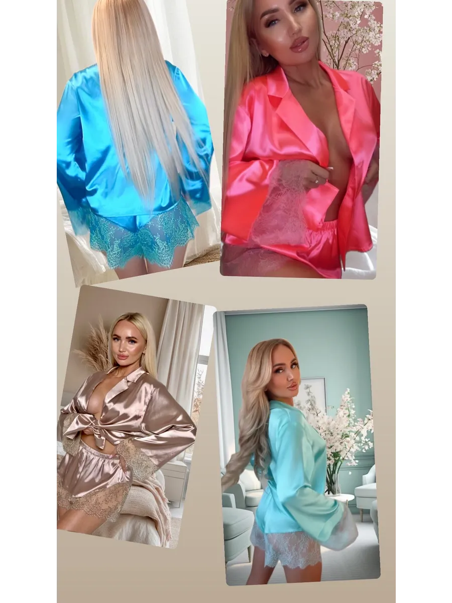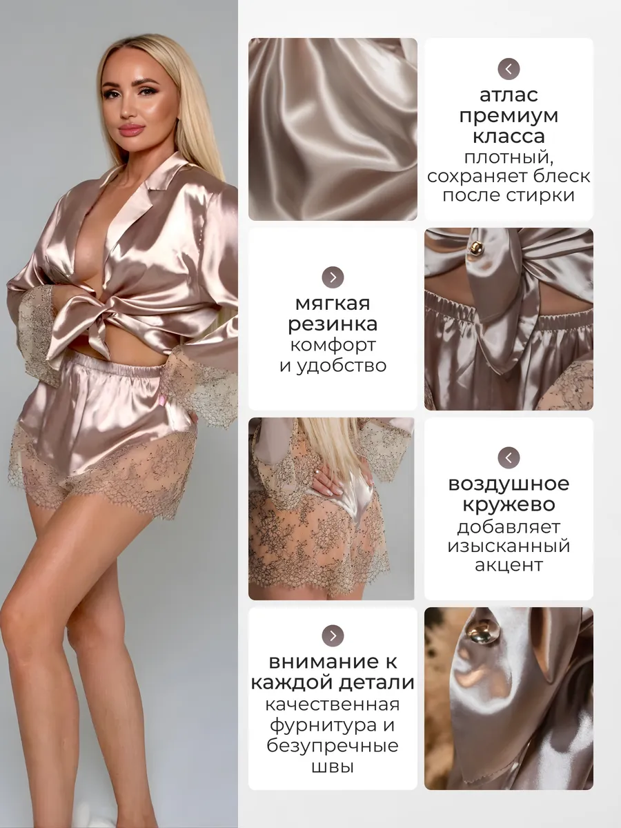 Элегантный домашний костюм из атласа-стрейч с кружевом.