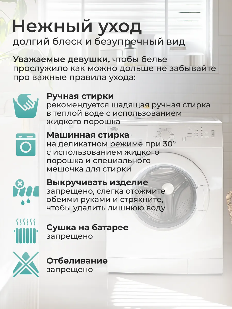 Деликатная стирка при 30°C. Не отжимать. Сушить в расправленном виде. Гладить с изнаночной стороны.