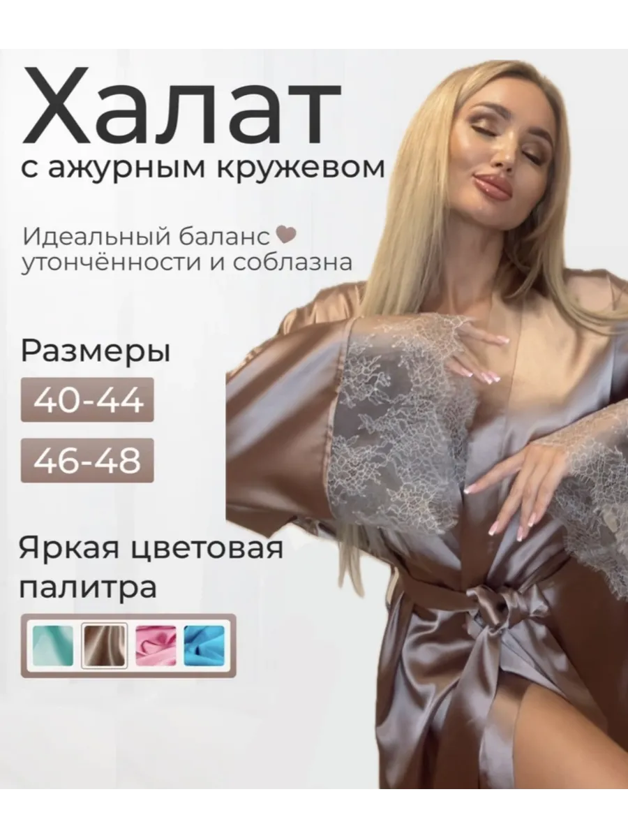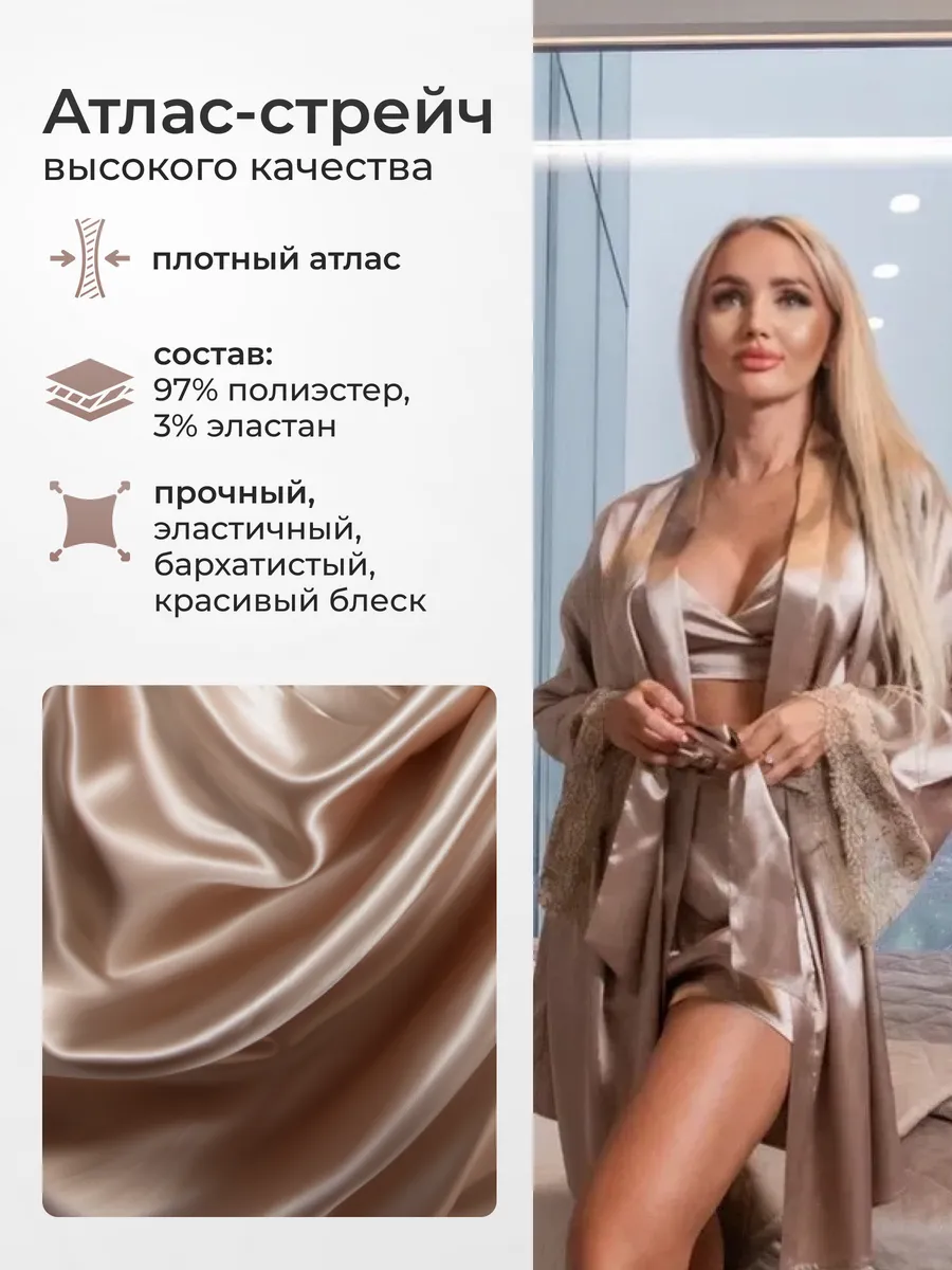Элегантный женский халат из качественного атласа-стрейч с кружевом.